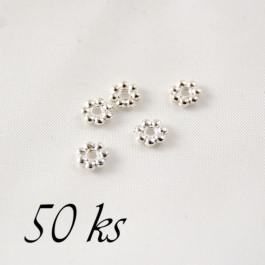 Mezidíl - kytička,stříbrná barva 50ksSkladem 7 bal18,00 Kč/ bal
