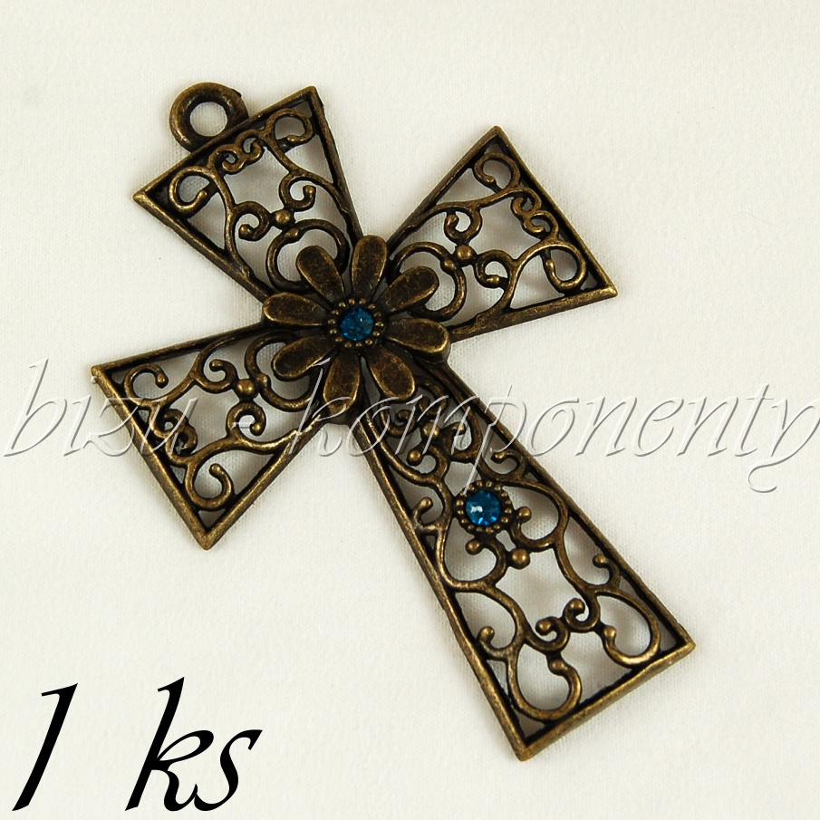 Velký kříž s kopretinou a modrými šatony, bronzová barvaSkladem 5 ks57,00 Kč/ ks